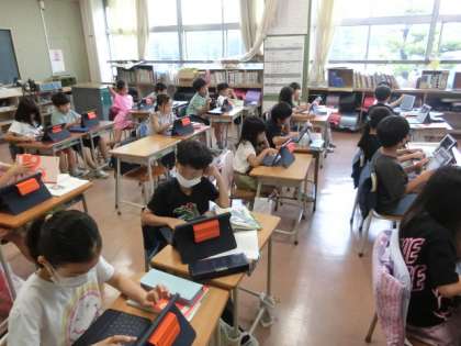 子どもたちは、文章の組み立てについて、みんな一生懸命にタブレットに書き込みをしていました。