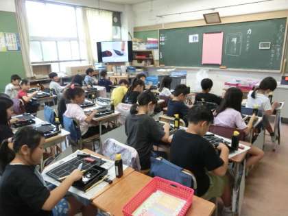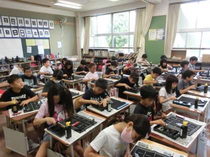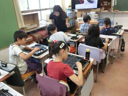 1組の授業は習字です。廊下を歩いていると、硯で墨をする音が聞こえてきます。のぞいてみると、子どもたちが話もせずに静かに硯で墨をすっています。普段は墨汁を使っていますが、今日は墨をするところから始めているそうです。