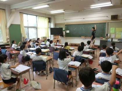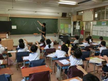 カタカタの書き方の学習です。みんなで空書きをしています。1年生の子どもたちは、とても楽しそうに手を伸ばして字を書いています。