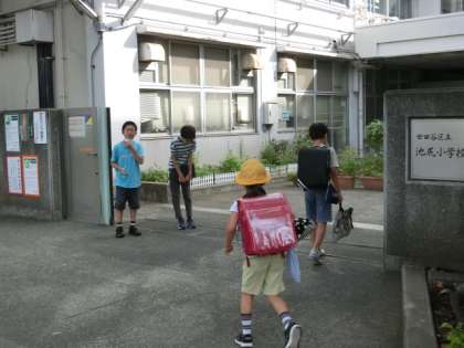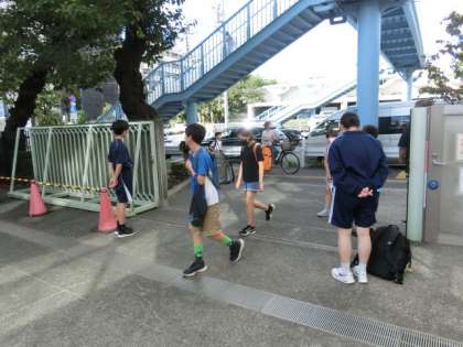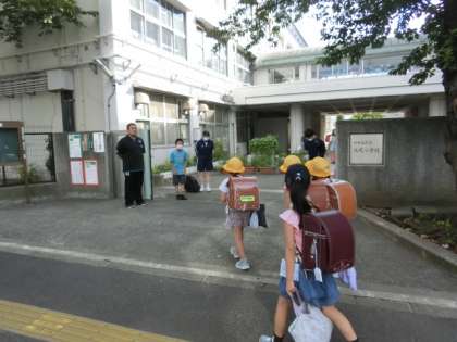 今週はあいさつ運動です。三宿中学校の人たちが、みんなとあいさつをするためにやってきてくれています。池尻小の代表委員も一緒に門に立っています。