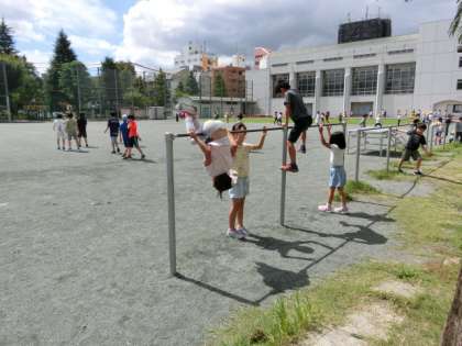 子どもたちが校庭に出てきました。ボール遊び鉄棒遊び、おにごっこなどで子どもたちは元気に遊んでいます。