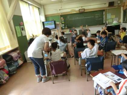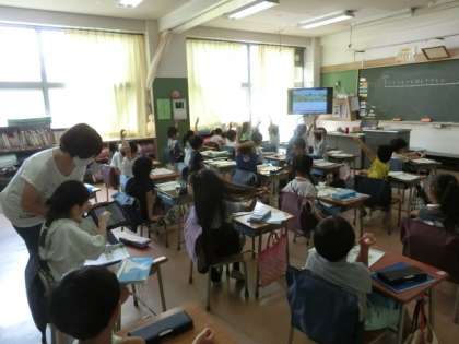 線の上に数が並んでいます。途中、空欄になっています。数と線を一緒に考える学習です。タブレットに直接書き込んで、答えを共有していました。
