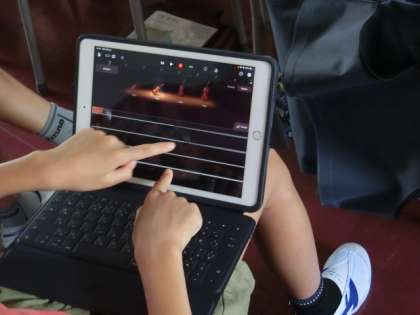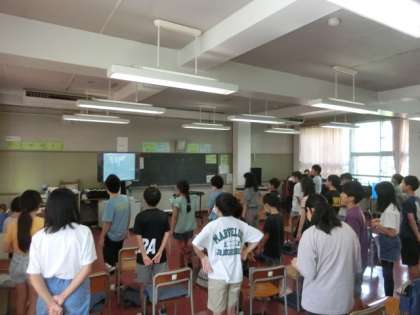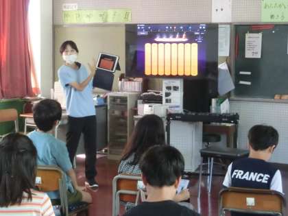 はじめは歌を歌い、そのあとは、弦楽器・金管楽器・木管楽器・打楽器の音色をタブレットのアプリを使って、試聴しました。楽器によって、音色がずいぶん違うことが分かります。