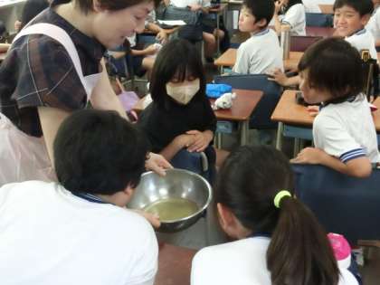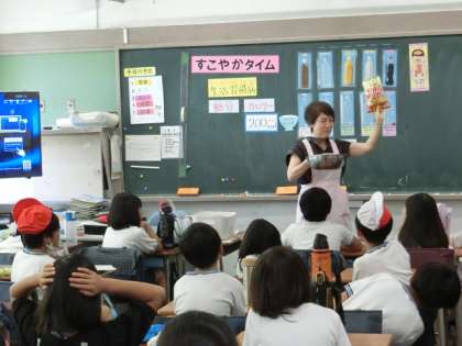1組は「すこやかタイム」の時間でした。養護の先生が話をしてくれています。今日のテーマは生活習慣病です。ジュースに含まれている砂糖の量に子どもたちはびっくりしています。また、ポテトチップスにふくまれている油の量を実際に見て、驚きの声を挙げていました。