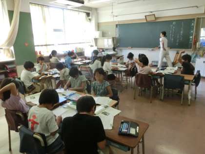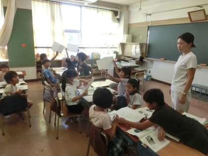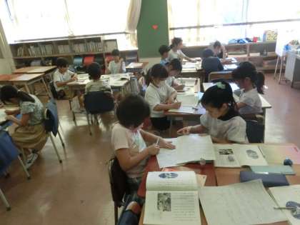 段落ごとにワークシートに要旨をまとめています。そして、班で確認をしています。
