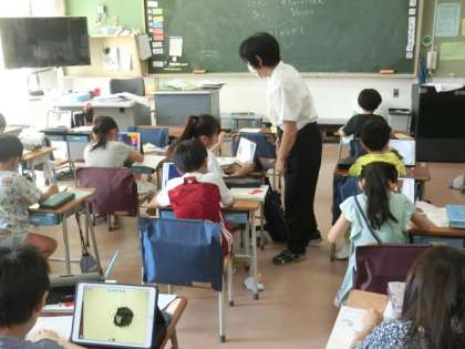 1組の授業は生活科です。あきのむしについて観察カードに記録していました。