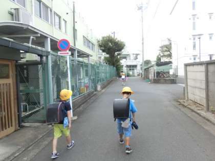 6年生と手をつないで歩いている3年生がいます。上級生と手をつなげる関係であるということ、とてもすてきだと思います。見ていて温かい気持ちになります。