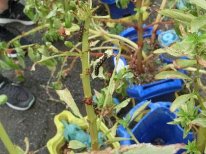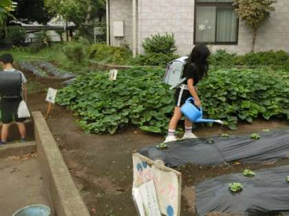 3年生の子どもたちがヒヤシンスの鉢に集まっています。ヒヤシンスに虫がついているのでとろうとしています。なかなかとれません。黒くてとても大きな虫です。3年生が言うには、この虫はヒヤシンスを食べてしまうそうです。