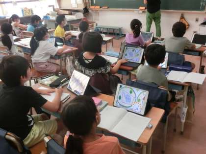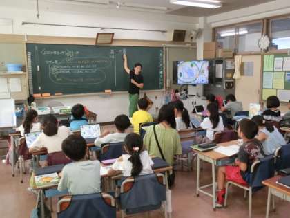 はこのような形、テントのような形という言葉が黒板に書いてありました。それらの形の名称を学んでいます。