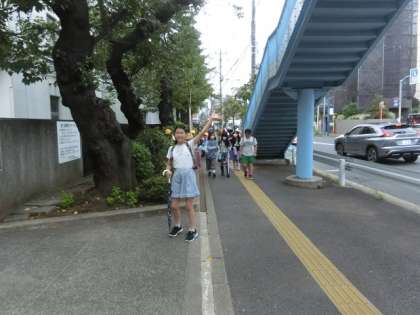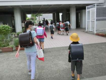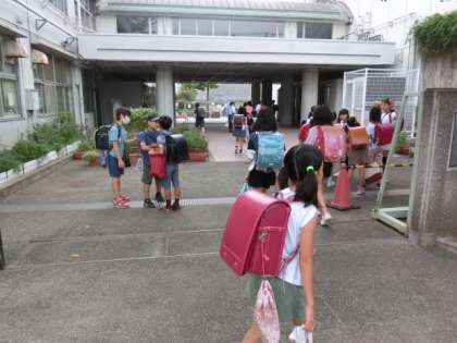 子どもたちが登校してきました。今日は比較的すずしい朝です。