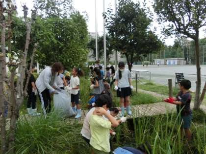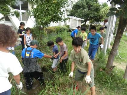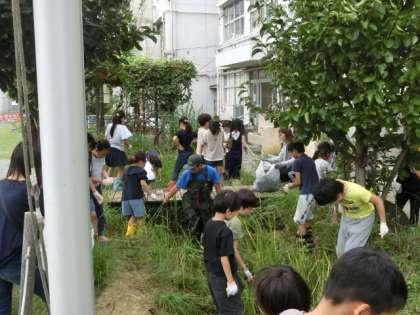 今日はビオトープギルドの方々にいらしていただいて、ビオトープについての学習です。実際にビオトープに入って、不要な草抜きをしました。長靴をはいている子どもたちですが、足を動かすのがままならない様子です。しかし、泥が付くのを嫌がる様子もなく、みんな楽しそうに活動しています。