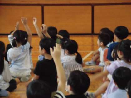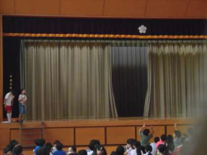 朝の時間は、集会委員会による集会が行われました。幕と幕の間を何かが通り、それを当てるとういうものです。さっと通り過ぎるため、「なんだった?」と友達と相談するなど盛り上がっていました。