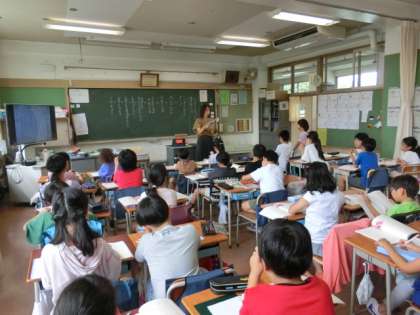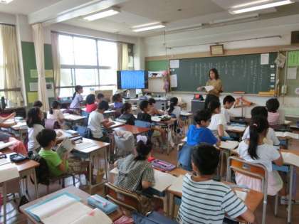 「ちいちゃんのかげおくり」の学習です。先生の発問に子どもたちが答えています。友達の発言をしっかりと聞いています。