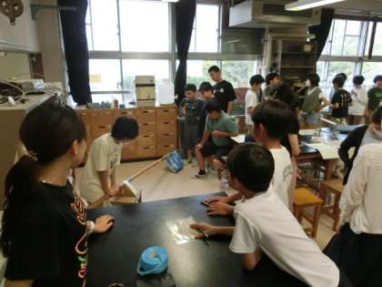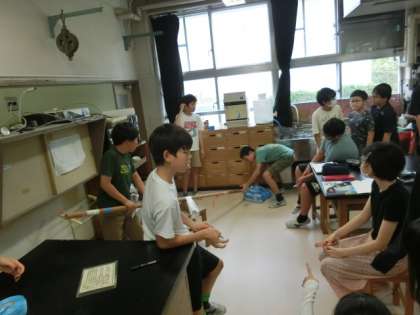 支点、力点、作用点のそれぞれの場所によって、棒を押す重さにどのように影響するかを木の棒とおもりを使い、体験しています。