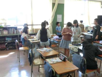 2組の授業は外国語です。寝る時刻や起きる時刻を友達と聞きあってワークシートに記入しています。寝る時刻を聞いていいたら、意外と遅い人が多いのにびっくりしてしまいました。みんな早く寝るようにしましょう。