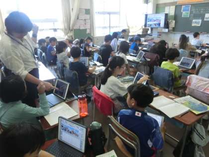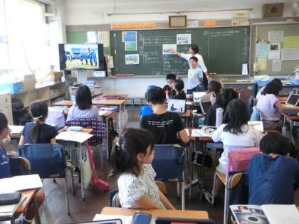 水害に備えるために、どのような活動をしているかを考えています。資料を見ながら、みんなで考えたことを発表しています。