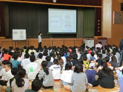 今日の音楽朝会はうた遊びです。歌に合わせて立ったり座ったりと体を動かします。