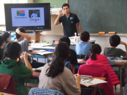 外国語の授業です。映像を見て、聞き取った事柄を全体で確かめていいます。