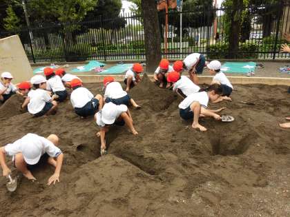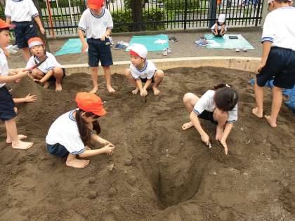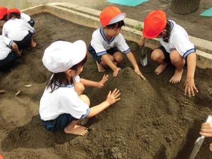 協力して山を作ったり穴を掘ったりして、子どもたちは砂の感触を楽しみました。前日の雨がしみ込んでいて、固まりやすかったようです。とても楽しく活動できました。