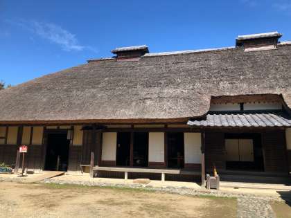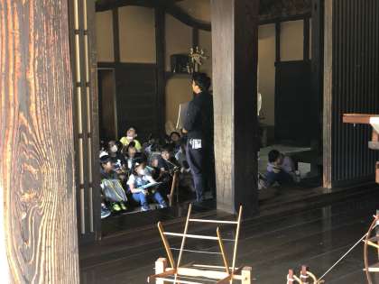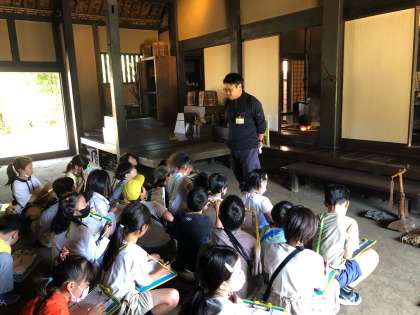 民家園の見学です。藁葺き屋根の民家の中で、当時の暮らしや道具について説明をしてもらいました。家の中に入ると土間があり、家の中でも土なのに、びっくりしていました。