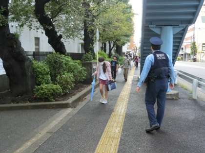 今日も池尻交番のおまわりさんが子どもたちを見守ってくれています。