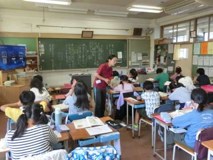 1組の授業は国語です。漢字の学習です。教科書の挿絵にある漢字を使って文章を作っています。文章を作るとその漢字の意味がはっきりとします。文章で漢字を覚えることはとても大切です。