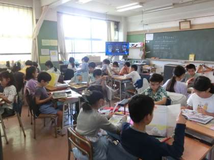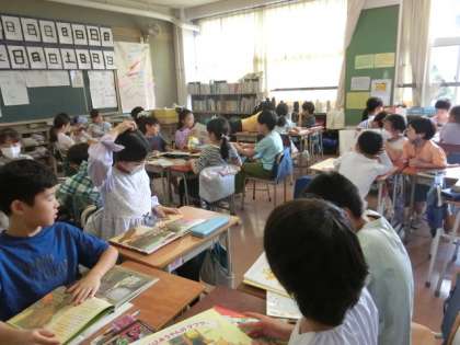 2組の教室では、子どもたちが班の形にして、本を読んでいました。2年生に読み聞かせをする際の本を班ごとに選んでいるようです。