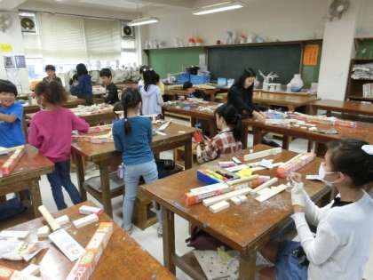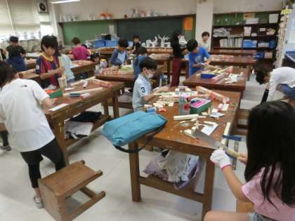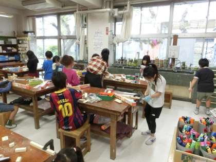 1組の授業は図工です。のこぎりを使って木を小さく切り、それを組み合わせて思い思いのものを作ります。