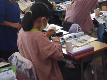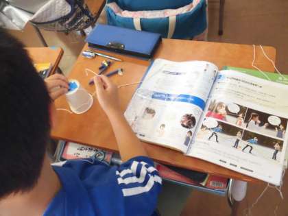 理科「音を伝えよう」の学習として、糸電話を作っています。実験が楽しみになります。
