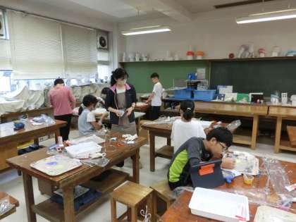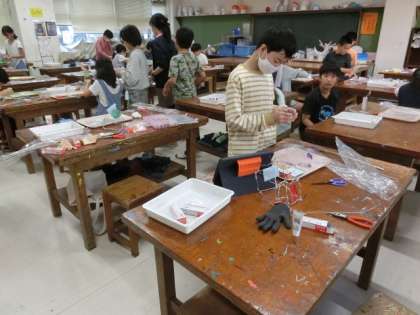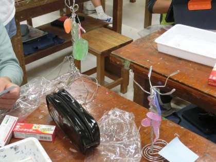 1組の授業は図工です。アルミ線を細工して、立体作品を作っています。アルミ線の間に色を付けた木工用ボンドを塗り、装飾しています。
