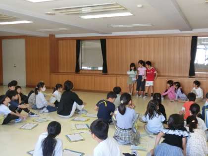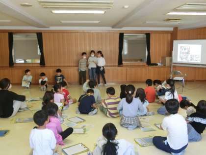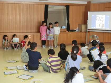 まちたんけんの学習です。各班でまとめた池尻の町の様子を発表しています。学年で行っているので、ミーティングルームで行いました。