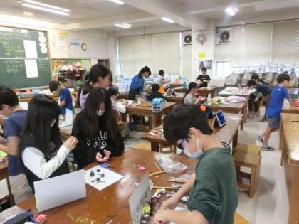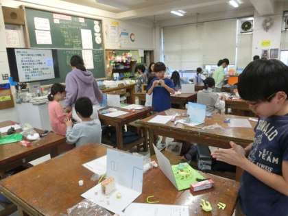 紙粘土に色を混ぜながら、立体を仕上げています。自分が選んだお話のどんな場面をつくっているのでしょうか。