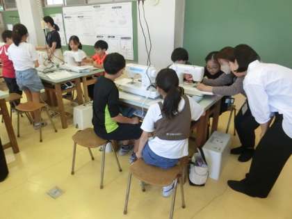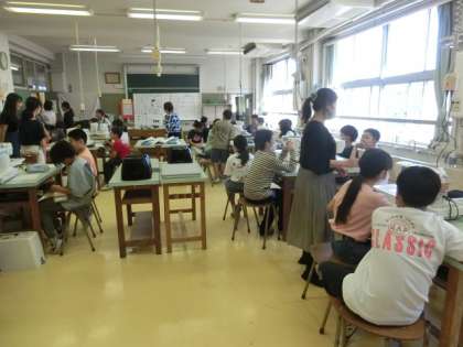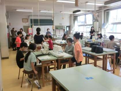 ミシンの学習です。保護者の皆さんにも手伝ってもらっています。けがのないように慎重に取り組んでいます。