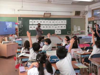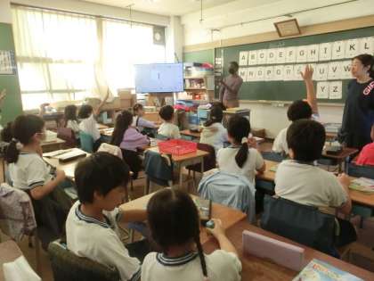 1組の授業は、外国語です。アルファベットの学習です。アルファベットの歌を子どもたちはとても楽しそうに歌っています。英語の部分もしっかりと歌うことができています。