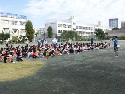 「おさない かけない しゃべらない もどらない」の原則を守り、避難をします。校庭に避難した後は、避難訓練の今日の動きについての話をしました。