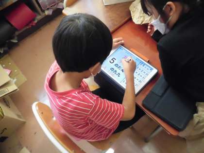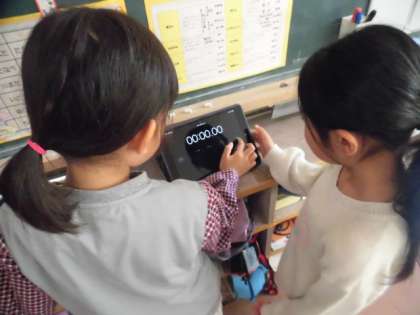 九九、五の段の練習です。友達同士で聞きあってサインをもらっています。タイムを計りながら、励ましあっている姿がいたるところで見られました。