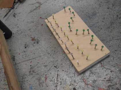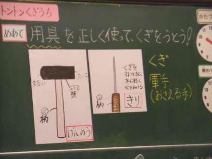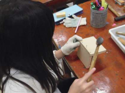 図工では、用具を正しく使うということを学習しています。安全に釘を打つ方法を身に付け、想像を広げて作品に仕上げています。