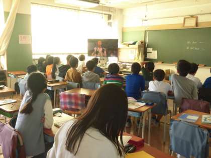 学芸会で取り組む作品の動画を鑑賞しています。作品のイメージを掴んでいます。