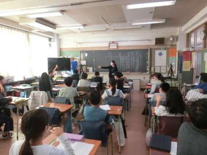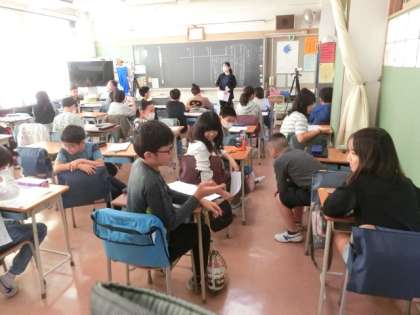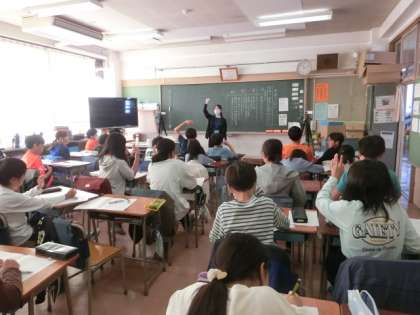 5年生の教室では、校内研究でお世話になっている大学の先生の関係で、大学生が説明文の授業をしていました。授業以外でもボランティアとして、子どもたちとかかわってくれているので、子どもたちとの関係もよく、子どもたちは安心して授業を受けています。近くの友達と話し合う場面でもしっかりと話し合いをしています。