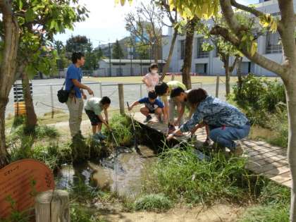 3年生は、ビオトープギルドの方々にいらしていただき、ビオトープの生き物の学習です。ビオトープに網を入れてすくい、生き物を探します。いろいろな生き物が出てきます。大きなやごもいます。子どもたちは歓声をあげています。