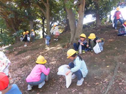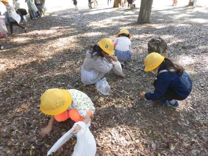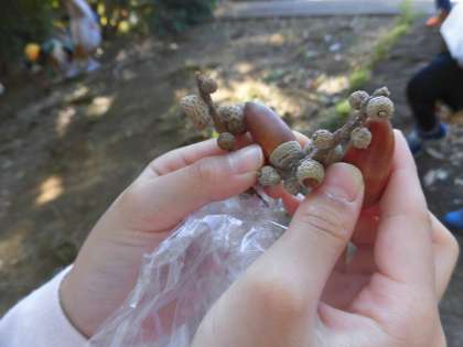 たくさんの実が落ちていて、どんぐりを入れる袋はすぐにいっぱいになりました。どんぐりのかさも見付け、子どもたちは大喜びでした。