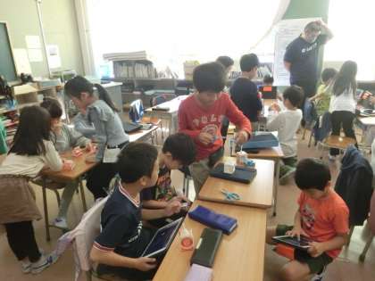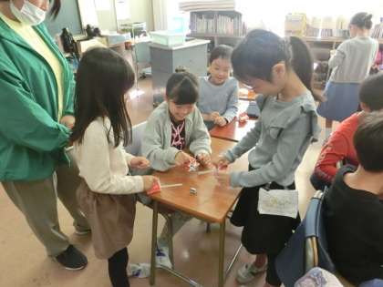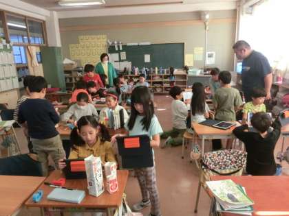 1組の授業は生活です。給食で出てくる牛乳パックを使って、おもちゃを作っています。今回は試しで作っているとのことです。次回から家から大きなパックを持ってきて作り始めるそうです。