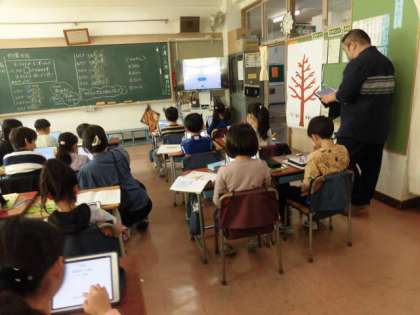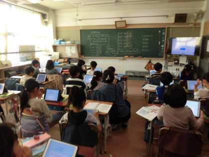 算数の九九の学習です。1組の先生が作成した九九問題を2組もチャレンジしています。学習用端末を使って、楽しみながら取り組んでいます。
