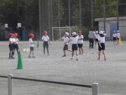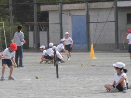 体育では、ティーボールに挑戦しています。友達同士、教えあったり、励ましたりする声が聞こえてきます。