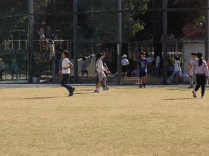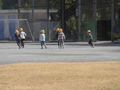 6年生は連合体育大会でいませんが、1〜5年生は元気に外で遊んでいます。校庭のネットや工事の場所は危険なので入らないよう声をかけています。