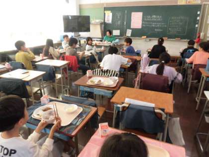 4年生は、給食当番がお休みでも助け合って、てきぱきと給食準備を整えていました。会話も楽しみながら、食事をとっています。リンゴが大人気でした。