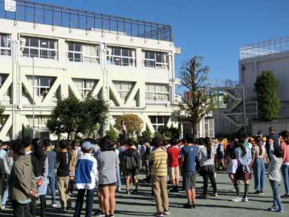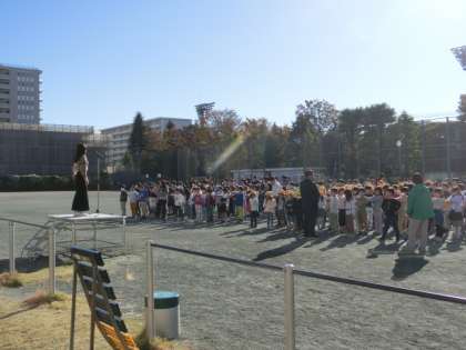 今日は月曜日、全校朝会です。子どもたちが校庭に集まってきました。
