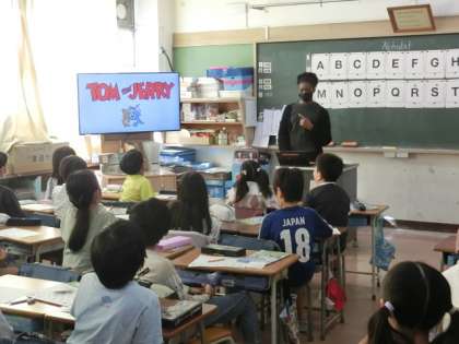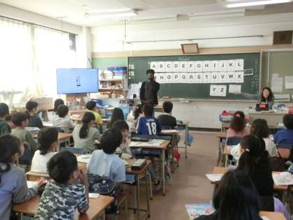 1組の授業は外国語です。ALTの先生がきています。