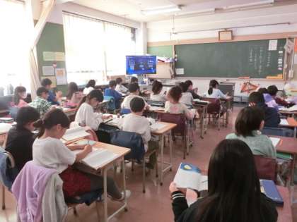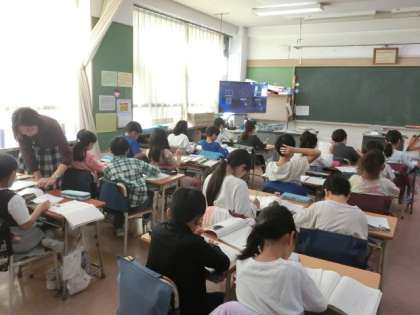 教材の物語を読んだ感想をノートに記入しています。教室はとても静かです。話をしている人は一人もいません。静かに学習をすすめる3年生です。