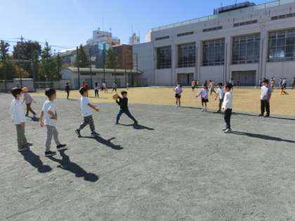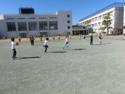 子どもたちは元気に校庭を走り回っています。つっちーの奥の方では、高学年の人たちがサッカーをしています。